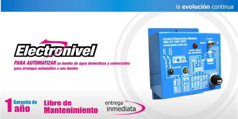 Control electrónico diseñado para el hogar u oficina, opera un sistema de llenado de agua en tinacos, por niveles, opera una motobomba hasta una capacidad de 1 hp a 127v. 60Hz. 1 Fase. Cuenta con protección por bajo nivel de agua para evitar el trabajo en seco de la bomba. Selector de operación MANUAL-FUERA-AUTOMATICO. Luces indicadoras de Encendido, Bomba Operando y protección por Bajo Nivel en la cisterna. Esta fabricado en un gabinete metálico, con acabado en pintura epóxica horneada en color verde. Se instala de forma sencilla, incluye accesorios, como son diagrama de instalación, electrodos de nivel, tornillos y taquetes.